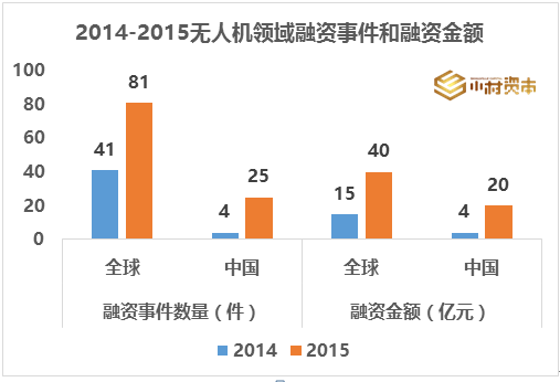 据泰伯智库统计,2014年,全球民用无人机领域共发生41笔融资,融资总额约15亿元。2015年,数字攀升到了81笔融资,超过40亿元,同比增长170%。