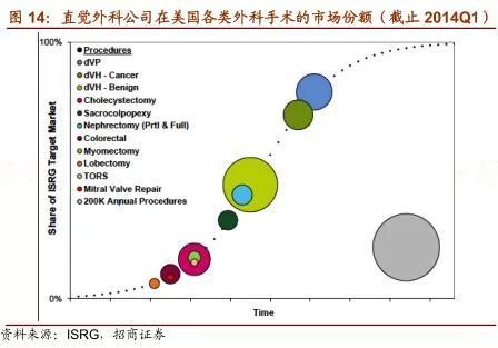 直觉外科公司微创机器人辅助手术机器人的领先者,其机器人系统在各类外科手术中的市场份额呈阶度分布,在复杂手术中的地位领先。随着直觉外科公司在科研技术方面的继续投入和发展,可预期直觉外科在相当一段时间内会保持领先的竞争优势。